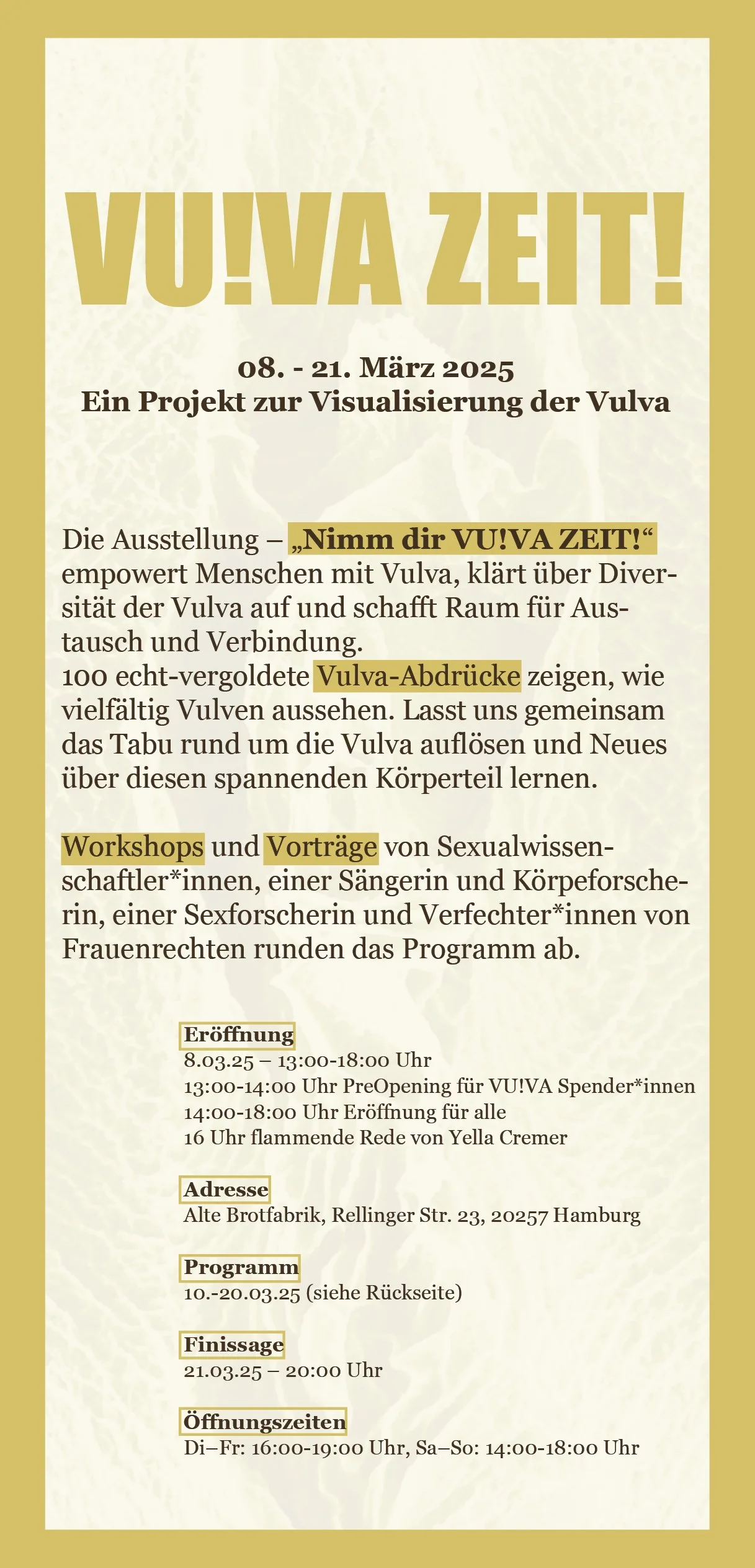 “The exhibition VU!VA ZEIT! empowers people with vulvas, raises awareness about vulva diversity, and creates space for exchange and connection. 100 real gold-plated vulva casts showcase the incredible variety of vulvas."